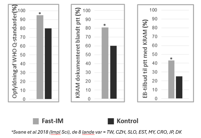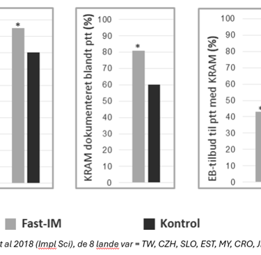 Modellen blev designet ud fra helt gængse værktøjer (inkl. PDSA osv.) og derpå testet internationalt i et multi-center RCT på 36 hospitalsafdelinger (36 unikke hospitaler) i 8 lande, med randomiseringen foretaget på ledelsesniveau. Interventionsgruppen brugte modellen i 1 år og kontrolgruppen fortsatte som vanligt uden modellen. Studiet viste at implementeringsgraden på det udvalgte kliniske område (her: KRAM-faktorer) blev signifikant løftet på blot det ene år (målt ud fra kvalitets-standardopfyldelse + dokumentation + tilbud/behandling). Vi lavede også et indlejret interviewstudie med patienter, ledere, læger, sygeplejersker m.fl. fra afdelingerne, som også viste positive resultater.